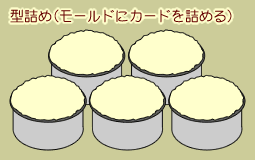 ホエイ排除後のカードを型に詰めます。1個当たりの量は2〜4kg程度。 原料乳にカビスターターを添加していない場合は、型詰めの際にカード重量の0.02〜0.04%程度のカビ粉末を均一に散布して混ぜます。また、型詰め時に加塩する場合の食塩の添加量はカード重量の1〜2%程度です。 カードを詰めた型はホエイ排除台にのせ、反転しながら自重でホエイを排出さ せて成型します。反転は15〜30分毎に5〜6回行った後、1時間毎に3〜4回、温度18〜25℃湿度80%以上を保った環境で行います。