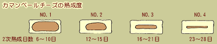 チーズをステンレス製の網状トレイに並べ、温度12〜14℃、湿度95〜98%を保った室内で9〜12日間熟成させます。 5日目頃からチーズ表面にカビが発生します。また、4〜5日目頃は多量の炭酸ガスが発生するので、熟成室の空気を流動させて、カビの生成に必要な酸素を確保しますが、チーズが乾燥しないよう注意が必要。毎秒20cm程度の風速が良好です。 熟成室は、あらかじめチーズに用いるのと同じカビを噴霧してから使用。他のカビに汚染されるのを防ぐため定期的に洗浄しなければなりません。複数の熟成室を用意するのが良策です。 |